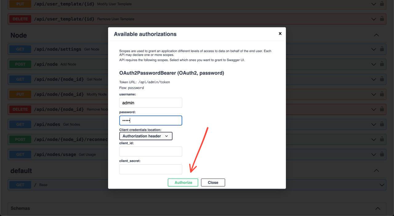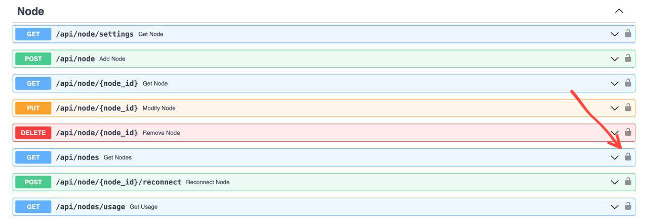 Внизу этой страницы перейдите в раздел NODE и нажмите на значок замка, у GET /api/nodes/.