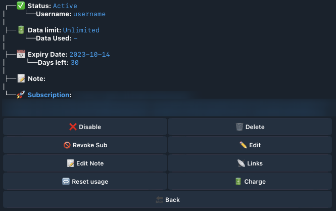 Готово! Пользователь по шаблону создан. Теперь он должен отобразиться как в боте, так и в самой панели Marzban: