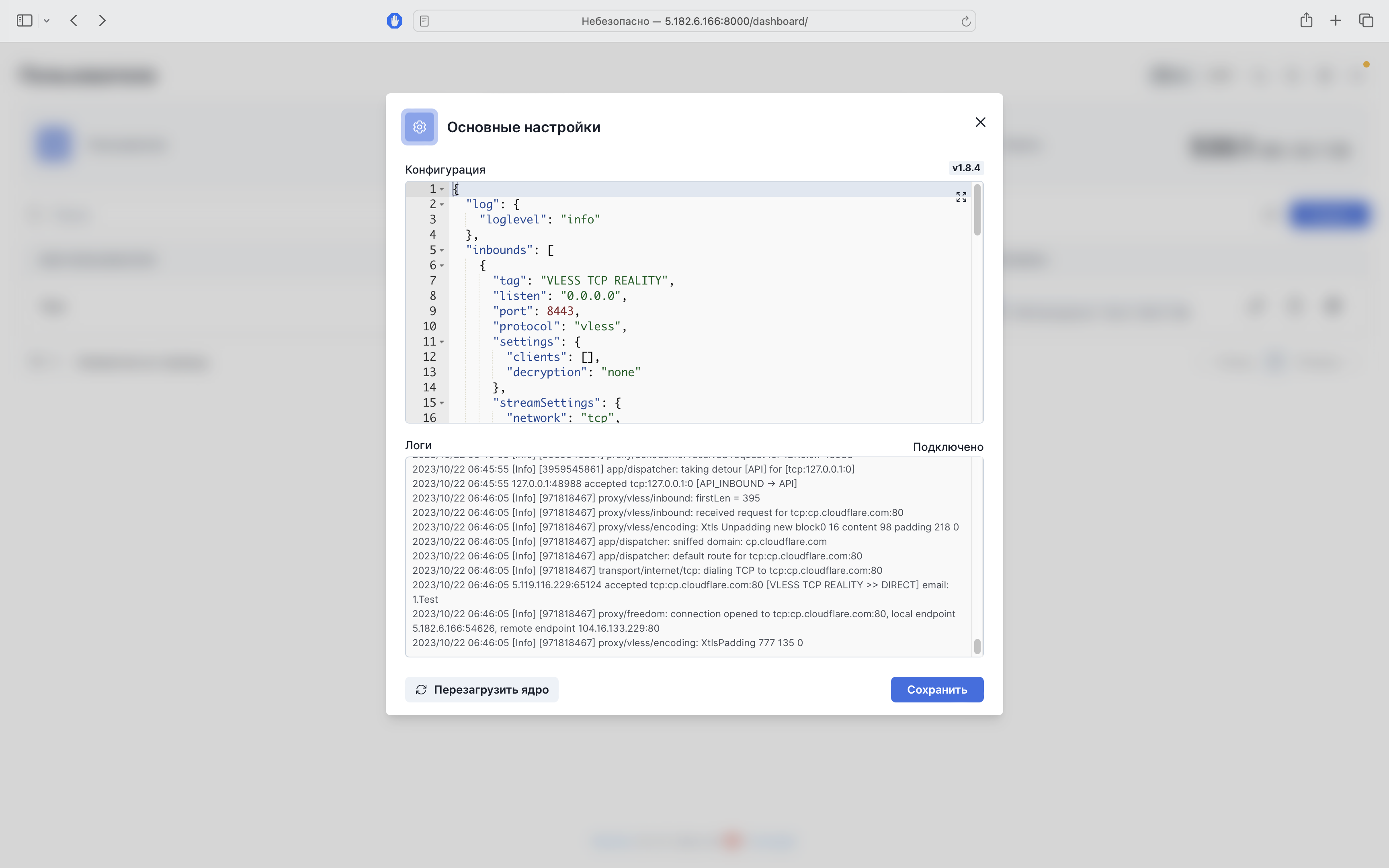 В данном разделе, Вы сможете отредактировать свой xray_config.json через удобный Web-UI.